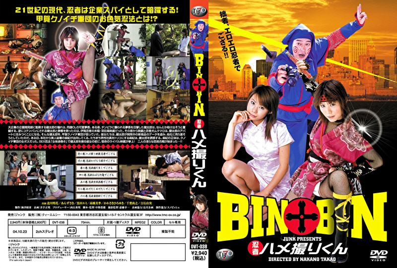 21世紀の現代、忍者は企業スパイとして暗躍する!甲賀クノイチ軍団のお色気忍法とは!?大企業の企画開発部に勤務する健太郎の憧れは、同僚OLの可愛夢香。ある夜、チンピラにわれる夢香を目撃した健太郎は、なんとか助け出そうと奮闘する。逆にコテンパンにされる健太郎と夢香を救ったのは、伊賀忍者の末裔・羽目鳥映蔵だった。その夜から映蔵と忍者犬ムクマロは、健太郎のアパートに住みつくことになる。そんな健太郎を、甲賀クノイチ軍団が狙っていた。彼女たちは、健太郎が開発中の新商品のデータを盗み、他社に売り渡そうとしていたのだ。ある日、本社から美人秘書の麻紀が出向してくる。たちまち男性社員をトリコにする麻紀は、健太郎を誘惑する。麻紀の正体は、クノイチ軍団の女ボスだった。SEX忍法「女体渦巻き」で健太郎を操る彼女の前に、宿命のライバル映蔵が参上! 二人の淫らな忍術合戦が始まった・・・!!/壱の巻:ハメ撮り映蔵 忍者でござる/弐の巻:忍法かげろう頭巾でござる/参の巻:忍法猫だましでござる/四の巻:忍法おぼろ灯篭でござる/五の巻:忍法女体渦巻でござる/六の巻:忍法蜜壺封じでござる/七の巻:めでたしめでたしでござる / BIN BIN 忍者ハメ撮りくん
